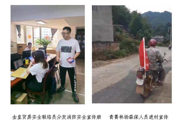 四是敲門入戶送平安。金皇貿(mào)易公司安全聯(lián)絡(luò)員逐一上門,為大廈內(nèi)承租戶分發(fā)消防安全宣傳冊(cè),增強(qiáng)承租戶防火安全意識(shí),提高自防自救能力。權(quán)屬企業(yè)漳平青菁林場(chǎng)通過發(fā)放宣傳單,小喇叭播放森林防火知識(shí)、森保人員進(jìn)村入戶開展森林防火法律法規(guī)宣傳等方式,向廣大群眾進(jìn)行消防安全知識(shí)宣傳,進(jìn)一步提高廣大群眾在森林防火、安全用火、安全避火等方面的常識(shí)和技能。