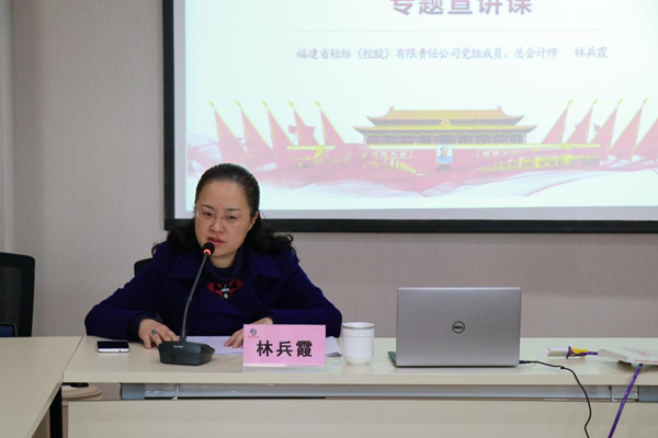12月20日下午,福建輕紡黨組成員、總會計師林兵霞到福建省金皇環(huán)??萍加邢薰拘v黨的十九大精神。金皇環(huán)保班子成員、支部黨員及金皇貿(mào)易黨支部黨員共近30人參加了此次宣講會學(xué)習(xí)。