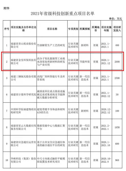 近日,福建省工業(yè)和信息化廳以《閩工信函科技〔2021〕476號》文發(fā)布了《關(guān)于印發(fā)2021年省級科技創(chuàng)新重點項目的通知》,金皇環(huán)保自主研發(fā)項目“高分子氧化絮凝型工業(yè)廢水深度處理新材料的研發(fā)與產(chǎn)業(yè)應(yīng)用”成功入選。