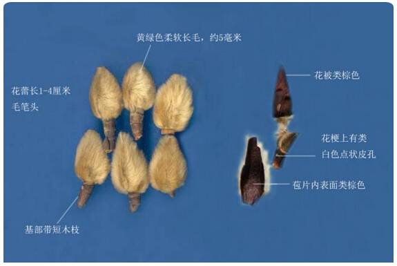 ▲望春花的干燥花蕾,呈倒圓錐狀,形如毛筆頭,黃綠色柔軟長毛,基部帶有木質(zhì)短枝。(圖片來源于網(wǎng)絡(luò))
