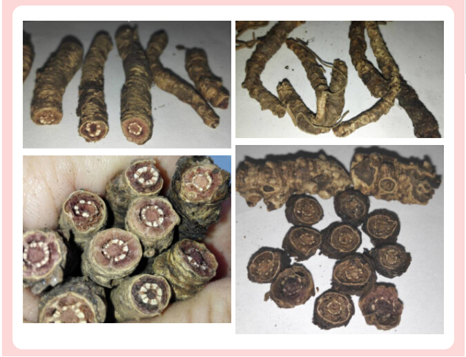 1960年中國(guó)醫(yī)科院藥物研究所科學(xué)家在相繼在西藏、云南發(fā)現(xiàn)了西藏胡黃連,認(rèn)為它的成分、性狀、功效均可代替進(jìn)口貨作藥材胡黃連用,因此1990年至今的國(guó)家藥典都將它作正品用。摘自《藥學(xué)學(xué)報(bào)》1965年12卷 12期(著名的生藥學(xué)家樓之岑老先生可是諾獎(jiǎng)獲得者屠呦呦的恩師呦) 胡黃連,玄參科胡黃連屬植物,一種多年生矮小草本。葉基生成蓮座狀,卵形,葉邊有鋸齒;花序穗狀,著生于花葶頂端,花冠深紫色;蒴果長(zhǎng)卵形;花果期7-9月。產(chǎn)西藏南部、云南西北部、四川西部;生海拔3600-4400米高山草地及石堆或淺土層的向陽(yáng)處。 胡黃連藥用部位為粗壯的根狀莖,其性寒,味苦;歸肝、胃、大腸經(jīng);可清熱燥濕、瀉火解毒。一般我們?cè)谑袌?chǎng)看見(jiàn)的藥材,都是條狀的根莖或飲片,已經(jīng)看不到葉子和花了,所以很難辨認(rèn)真?zhèn)蝺?yōu)劣。通過(guò)下面幾張圖,我們來(lái)看看胡黃連的優(yōu)劣。 其有效成分是胡黃連苷Ⅰ和胡黃連苷Ⅱ,經(jīng)檢測(cè),以下2組性狀不同的藥材含量也有明顯的差異:根莖較粗壯,直徑約為0.6~1.1cm,段較長(zhǎng),略彎、偶有分枝。鱗片狀葉柄多脫落,露出密集的環(huán)狀節(jié);凸起的根痕或芽痕較少;質(zhì)稍軟,更易折斷。根莖多細(xì)小,多為直徑0.4~0.8的小段,段長(zhǎng)短不一,彎曲較多、不規(guī)律,分枝多。表面鱗片較多處質(zhì)軟,表面具縱皺紋,環(huán)狀節(jié)較少,凸起較多,鱗片未脫落處表面及皮部呈黑色。 左—含量較高—白色維管束排列成規(guī)律的環(huán)狀;可見(jiàn)明顯的射線;皮部淡棕色至棕色,略帶紅色;皮部結(jié)構(gòu)較密實(shí)、相對(duì)較厚; 右—含量較低—維管束較小,排列不規(guī)則;射線難分辨;皮部棕色至黑色、不顯紅色;皮部結(jié)構(gòu)較松散、孔隙多、較薄。 以上2組圖均為正品胡黃連,只是含量有所差異。本人愚見(jiàn),認(rèn)為含量較高者(左上、左下)為西藏胡黃連,含量較低者(右上、右下)為胡黃連。 由于西藏胡黃連為野生植物,分布區(qū)狹窄,加上連年采挖,資源瀕臨滅絕,已被云南省列為重點(diǎn)發(fā)展的稀缺藥材品種,并被收載于《中國(guó)珍稀瀕危植物名錄》。所幸云南麗江已成功栽培出可替代野生的家種品,為野生珍稀植物的保護(hù)提供了途徑。