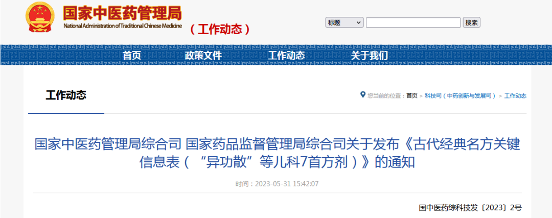 關于發(fā)布《古代經(jīng)典名方關鍵信息表(“異功散”等兒科7首方劑)》的通知