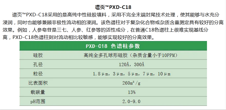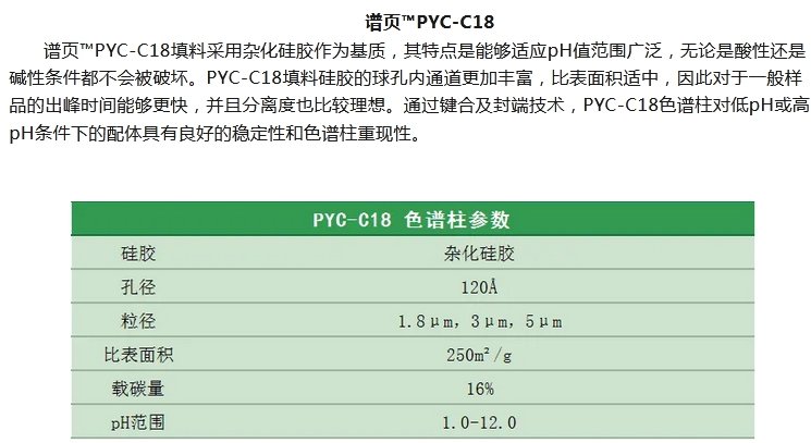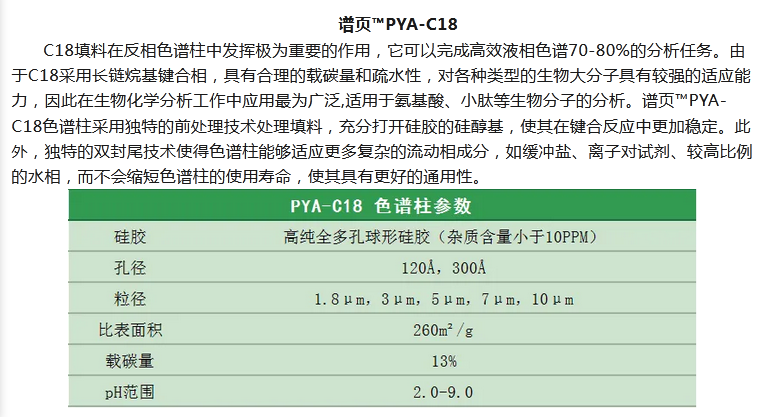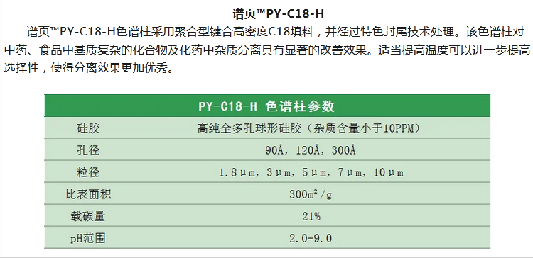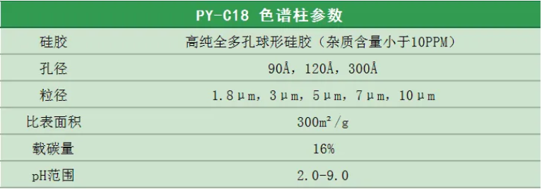 譜頁(yè)?PY-C18是本系列C18柱中最具普適性的色譜柱,具有優(yōu)異的穩(wěn)定性、獨(dú)特的官能團(tuán)鍵合及均勻的小分子封尾技術(shù)涂層,確保固定相具有高選擇性。加上獨(dú)有的裝柱工藝,使其擁有穩(wěn)定的基床,從而具有更高的柱效及批次間穩(wěn)定性。適合分離酸性、中性和堿性化合物以及小分子多肽等。