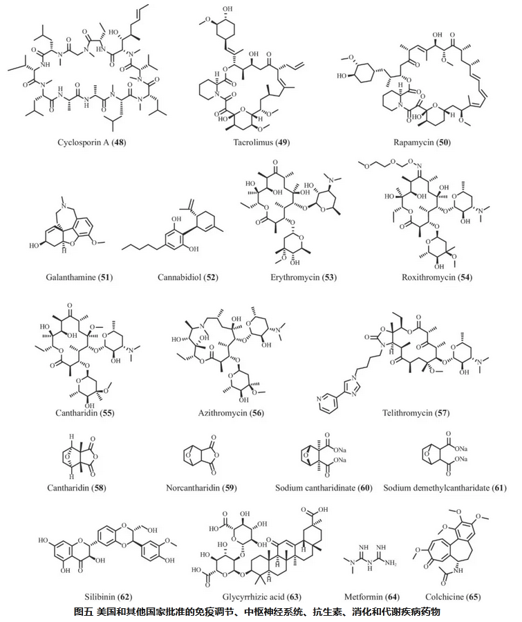 根據(jù)各種疾病的臨床治療需求,本綜述介紹了65種具有代表性的藥物,這些藥物或直接來源于天然產(chǎn)物,或來源于天然產(chǎn)物的衍生物。這些藥物已獲得國家醫(yī)藥產(chǎn)品管理局(NMDA)、美國食品藥品監(jiān)督管理局(FDA)、歐洲藥品管理局和日本藥品醫(yī)療器械管理局等監(jiān)管機構(gòu)的批準。在這些藥物中,有29種是在中國開發(fā)的,其余36種是在國際上獲得批準的。