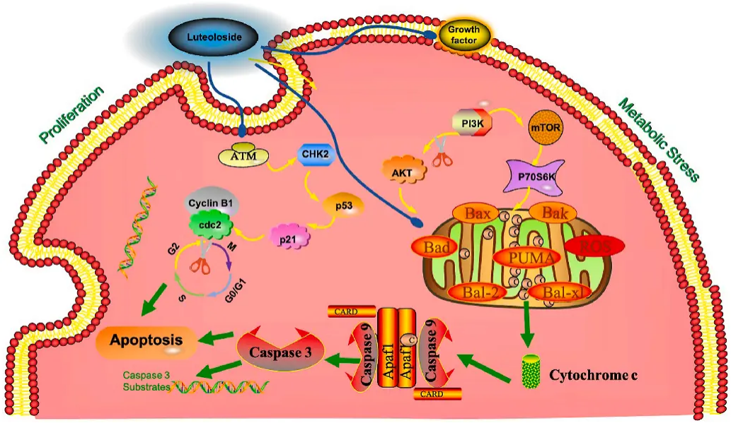 3.結(jié)直腸癌:木犀草苷通過雙重機制(線粒體凋亡通路激活和PI3K/AKT/mTOR通路抑制)抑制HCT116細胞增殖并誘導凋亡,其IC50為44.1μM,可作為功能性膳食成分或個性化營養(yǎng)治療的潛在候選物,為結(jié)直腸癌的天然藥物開發(fā)提供理論依據(jù)。[7]