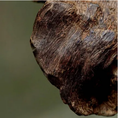 呈不規(guī)則塊、片狀或盔帽狀,有的為小碎塊。表面凹凸不平,有刀痕,偶有孔洞,可見(jiàn)黑褐色樹(shù)脂與黃白色木部相間的斑紋,孔洞及凹窩表面多呈朽木狀。質(zhì)較堅(jiān)實(shí),斷面刺狀。氣芳香,味苦。