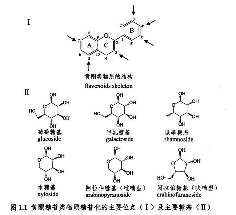 黃酮糖苷主要是由黃酮基本骨架主要位置上的氧化作用所形成的。糖取代基多以氫氧化形式與黃酮碳骨架相連,形成O-糖苷,也有少數(shù)與黃酮A環(huán)上的C原子直接相連形成C-糖苷,如牡荊素、葛根素等。糖基主要包括葡萄糖、半乳糖、鼠李糖、木糖、阿拉伯糖等,且部分糖基有乙?;⒖Х弱;?、香豆?;?、沒食子酰化等現(xiàn)象。