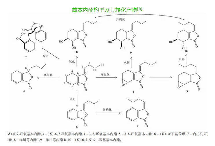 藁本內(nèi)酯結(jié)構(gòu)中有環(huán)外雙鍵可分為順反兩種異構(gòu)體即(Z)-Ligustilide和(E)-Ligustilide。由于Z型結(jié)構(gòu)為空間優(yōu)勢構(gòu)象比E型更穩(wěn)定,因而Z型藁本內(nèi)酯在中藥材中含量為E型的10倍以上[1]。藁本內(nèi)酯是不飽和苯酞結(jié)構(gòu)且3位上有活潑的丁烯基,因而穩(wěn)定性不佳極易發(fā)生異構(gòu)化、氧化、環(huán)加成、聚合等結(jié)構(gòu)變化產(chǎn)生其他結(jié)構(gòu)相近的苯酞類化合物。