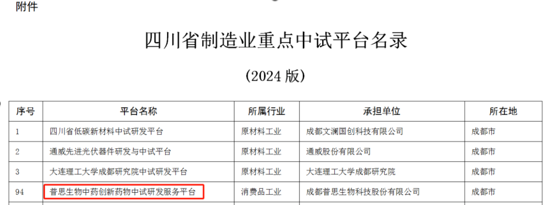近日,四川省經(jīng)濟(jì)和信息化廳辦公室印發(fā)《四川省制造業(yè)重點(diǎn)中試平臺(tái)名錄(2024版)》,成都普思生物科技股份有限公司的“普思生物中藥創(chuàng)新藥物中試研發(fā)服務(wù)平臺(tái)”成功入選。??