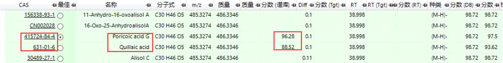 對(duì)于軟件擬合的分子式,可通過“N規(guī)則”、天然產(chǎn)物常見元素、擬合的質(zhì)量偏差、擬合分?jǐn)?shù)等進(jìn)行進(jìn)一步縮小范圍,獲得最可能的分子式結(jié)果,以獲得更準(zhǔn)確結(jié)果。