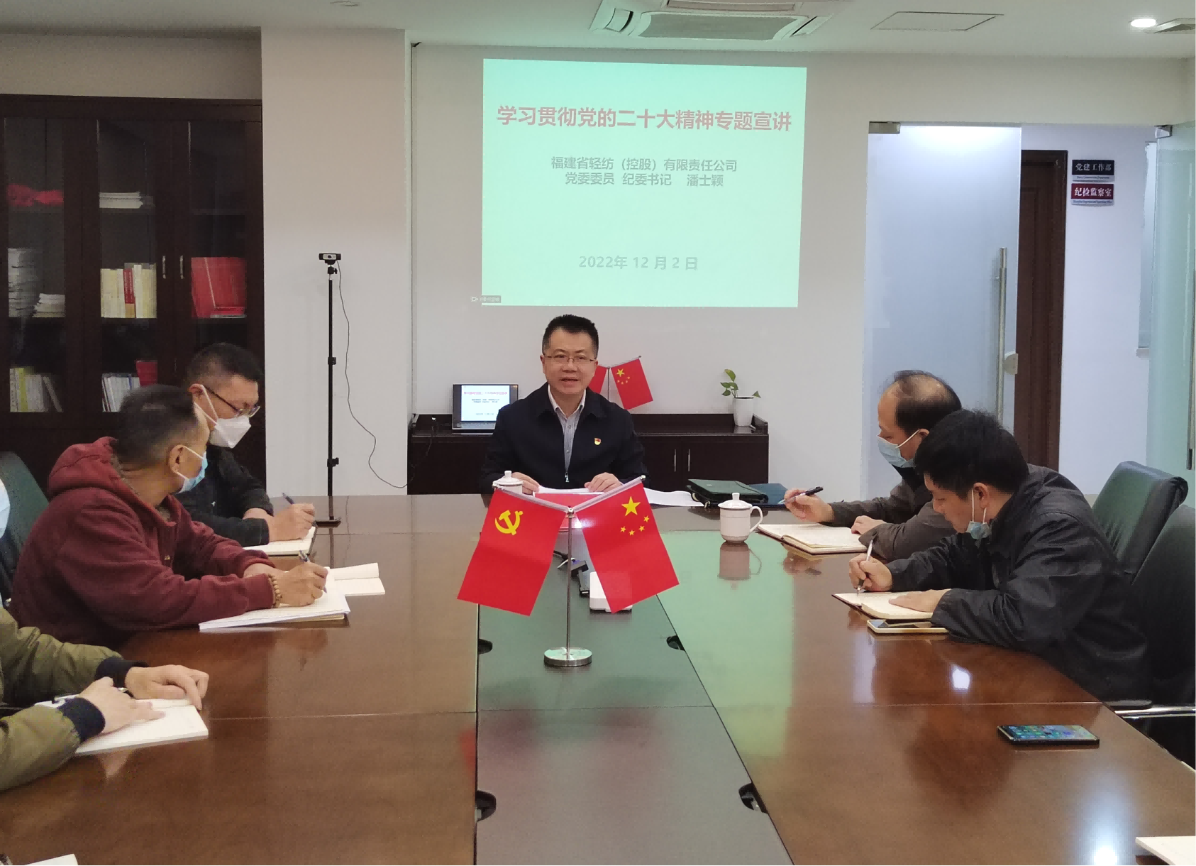 12月2日下午,福建輕紡黨委委員、紀(jì)委書(shū)記潘士穎到福建省輕工業(yè)研究所有限公司作學(xué)習(xí)貫徹黨的二十大精神專題宣講。輕工所黨總支領(lǐng)導(dǎo)班子、在職黨員、入黨積極分子及部分員工等17人參會(huì)。