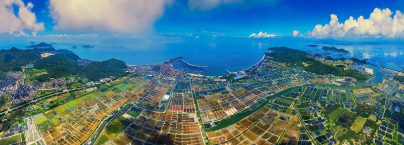 (山海如卷,鹽田作畫。福建生態(tài)鹽田鑲嵌于青山碧水間,將大海的精華凝粹為人間至味)