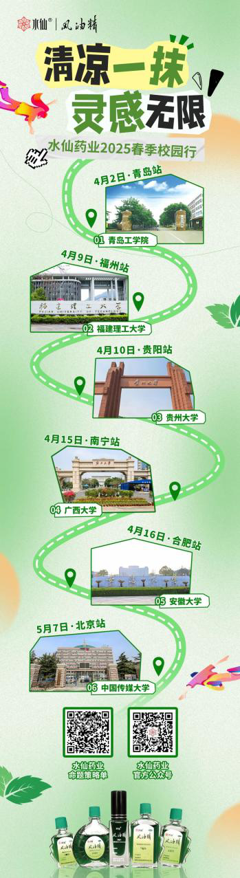 春日來襲,生機(jī)盎然。1月中旬,水仙藥業(yè)攜手創(chuàng)意星球,面向全國各大高校發(fā)布命題策略單,正式拉開水仙藥業(yè)學(xué)院獎(jiǎng)春季賽事帷幕,目前賽事進(jìn)入全國作品征集階段。為更加貼近年輕人的生活,4月2日起,水仙藥業(yè)將前往青島、福州、貴陽、南寧、合肥、北京六地開展“水仙藥業(yè)2025春季校園行”活動(dòng)。