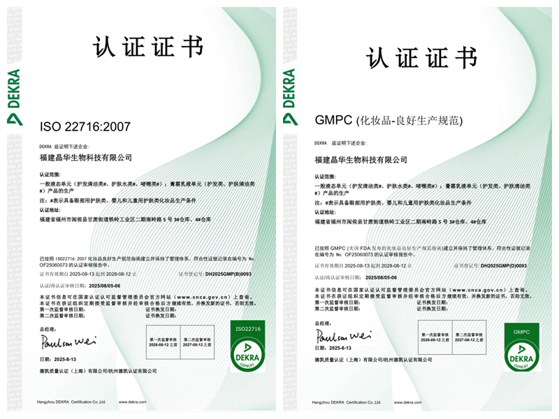 近日,工控集團(tuán)權(quán)屬福建晶華生物科技有限公司成功通過權(quán)威機(jī)構(gòu)ISO 22716/GMPC化妝品良好生產(chǎn)規(guī)范質(zhì)量管理體系認(rèn)證。這標(biāo)志著晶華生物的產(chǎn)品質(zhì)量與生產(chǎn)管理體系全面接軌國際標(biāo)準(zhǔn),為企業(yè)拓展海外客戶、開拓國際市場奠定了堅(jiān)實(shí)基礎(chǔ)。